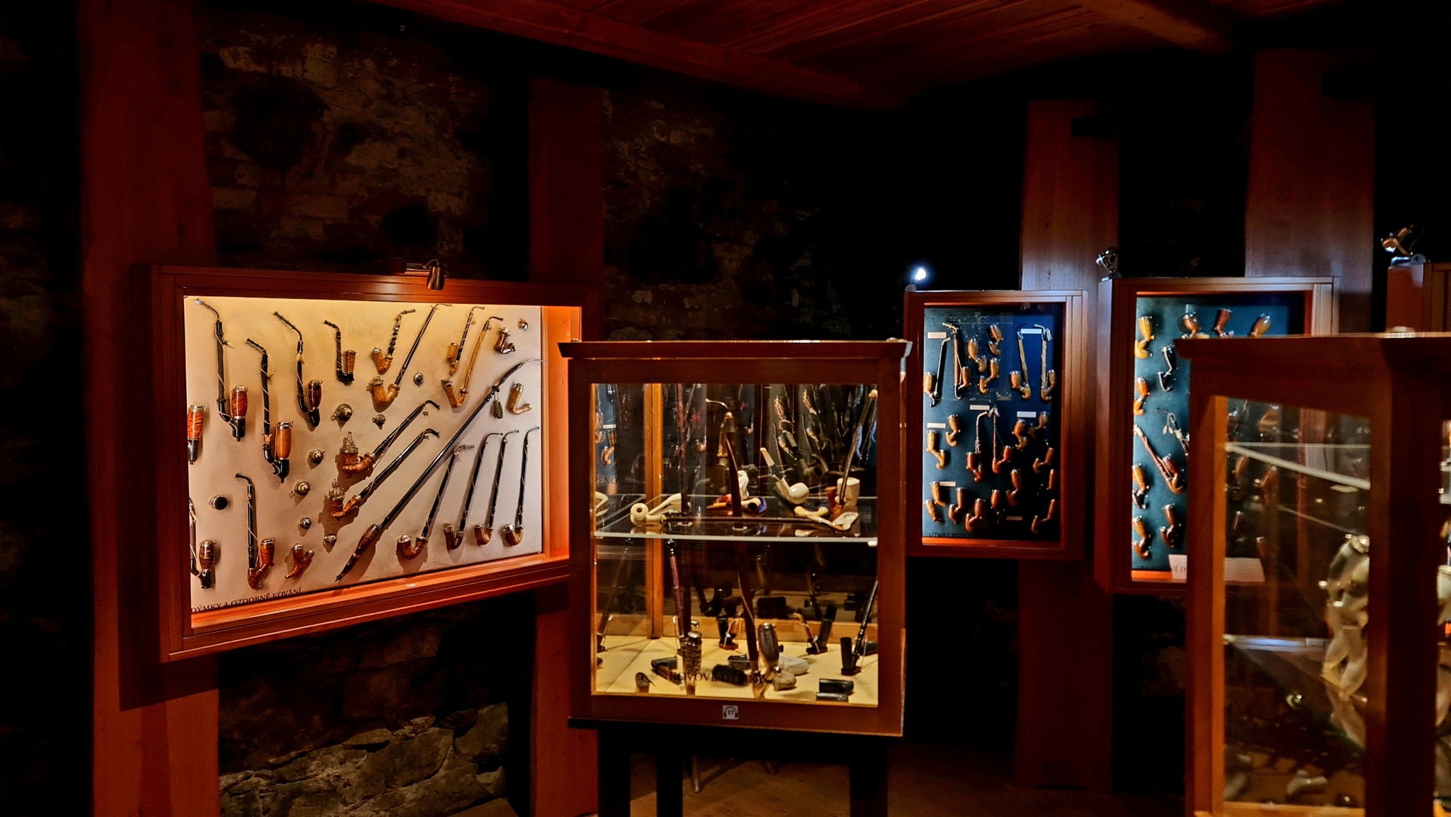 Der erste Teil bot den Poeten einen Einblick in den vollständigen Anfang der handwerklichen Tabakproduktion bis hin zu den ersten Drehmaschinen und anderen Maschinen. Ein sehr freundlicher Museumsführer fügte interessante Erklärungen hinzu, was er auch für die kuriosen Stücke in der Sammlung des Museums tat (siehe Fotos). Dieser Teil war zudem in zwei Sektionen unterteilt. Sektion A enthielt die erwähnten Maschinen und die Sammlung von Pfeifen. Sektion B hingegen zeigte künstlerische Werke, die mit Pfeifen verbunden sind, wie das berühmte Bild "Das ist keine Pfeife" von René Magritte. Außerdem gab es hier den Rest der Museumsammlung zusammen mit Pfeifen bekannter tschechischer Persönlichkeiten (z.B. die Peterson-Pfeife von Karl Schwarzenberg).