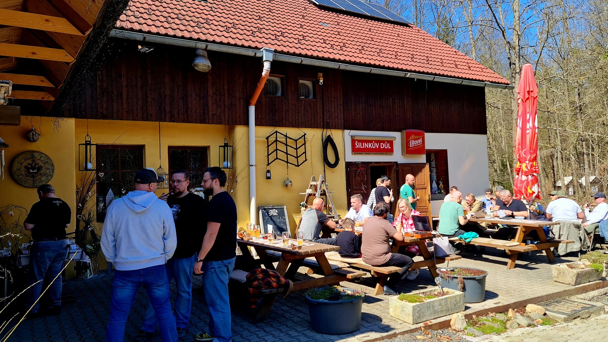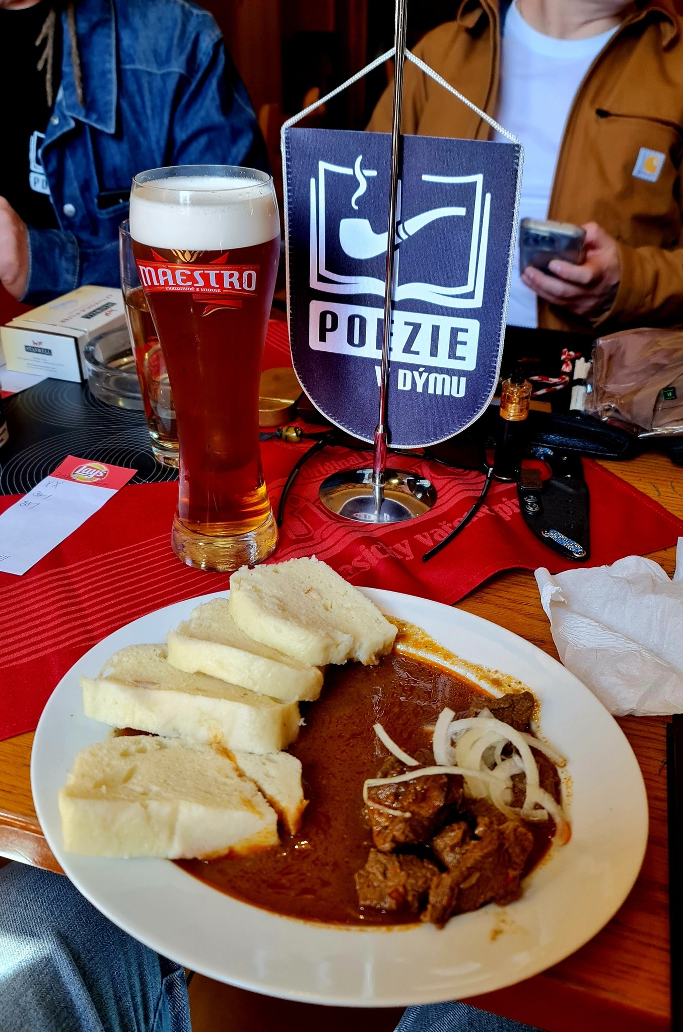 Nach einem recht nahrhaften Vormittagsprogramm haben sich die Gruppen, die die Fabrik und das Museum besichtigt haben, zusammengeschlossen und sind zum Mittagessen in eine schöne, abgelegene Gaststätte in Šilinkově Dole gegangen. Dort boten sie den Poeten einen hervorragenden Gulasch, entweder mit Knödeln oder Brot. Und nicht nur das - auch Bier verschiedener Sorten (einschließlich des "lava"-Biers Maestro, siehe Fotos), Holunderlimonade, Würste, Utopence und mehr.
