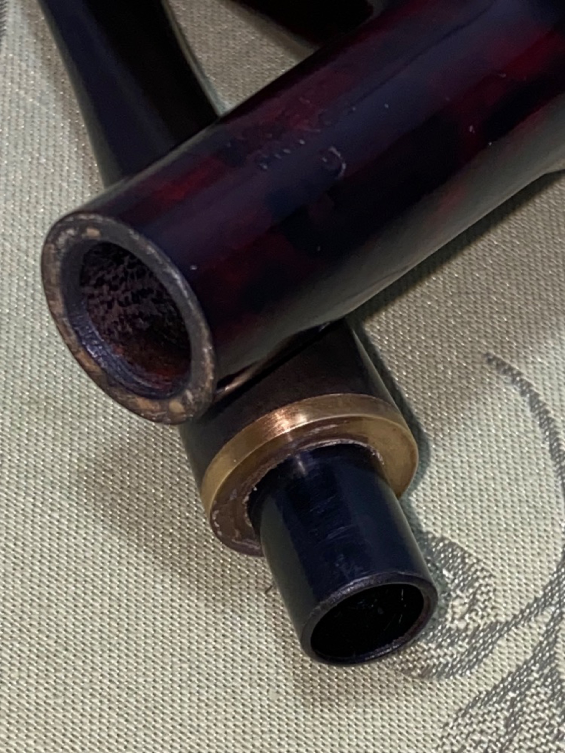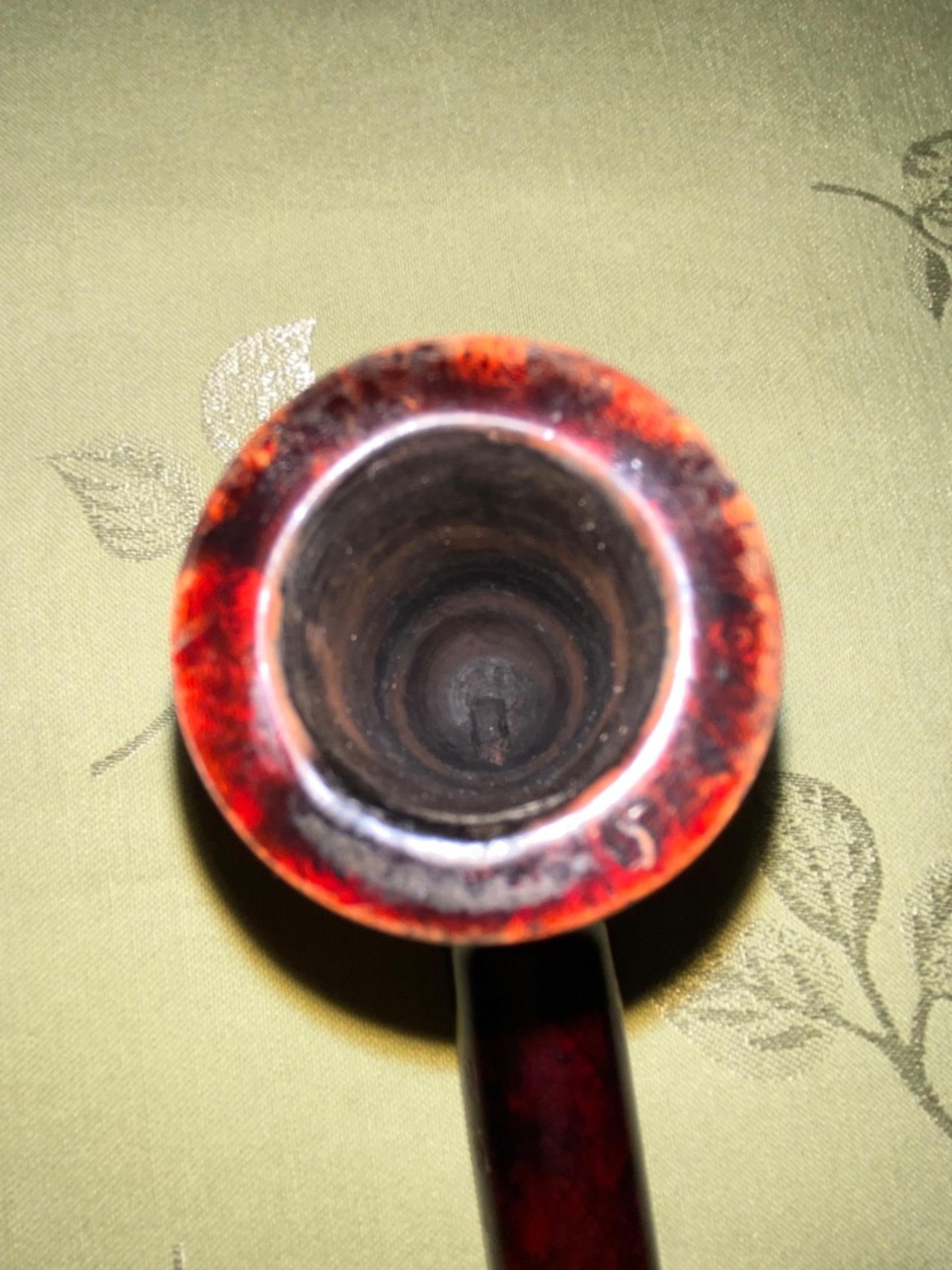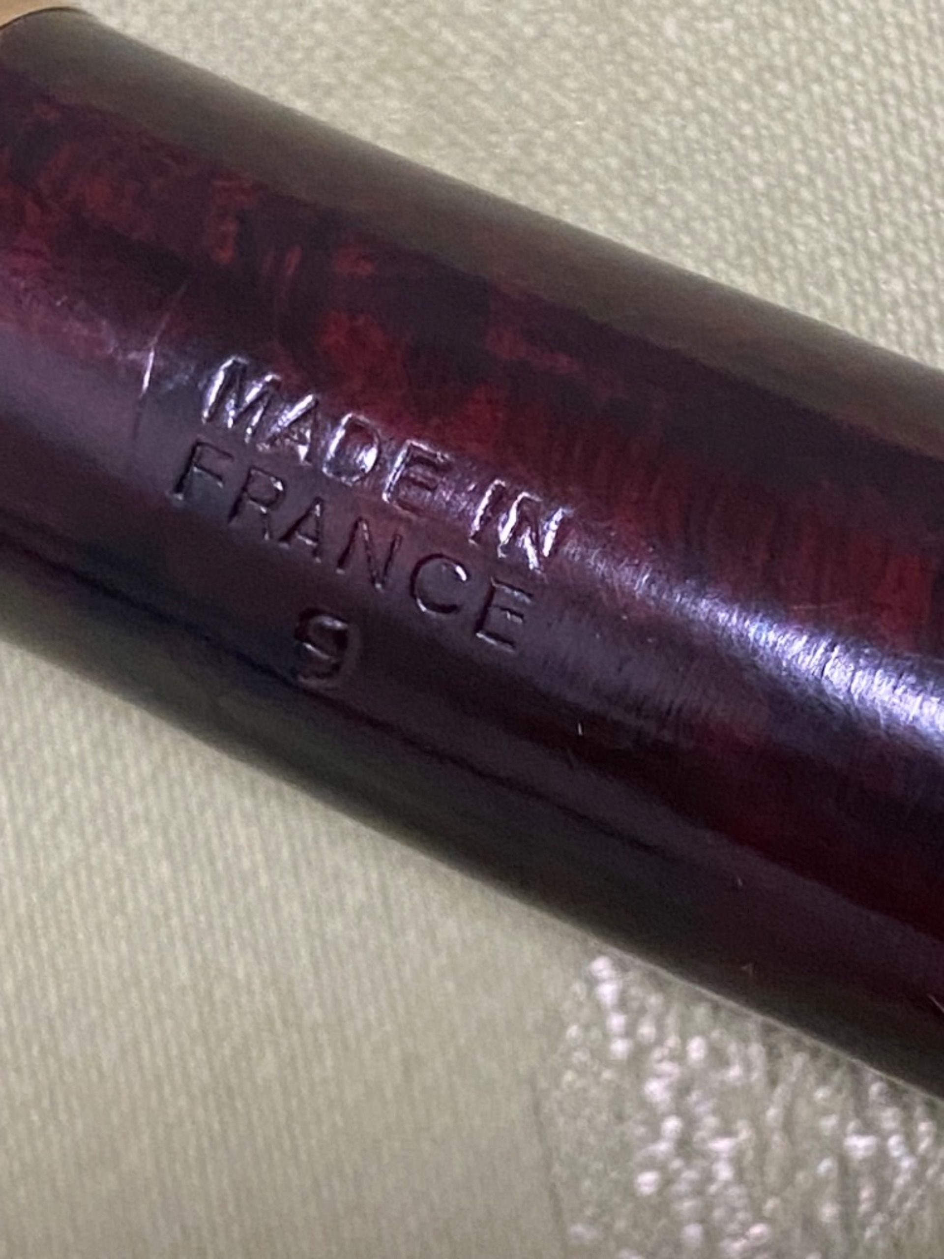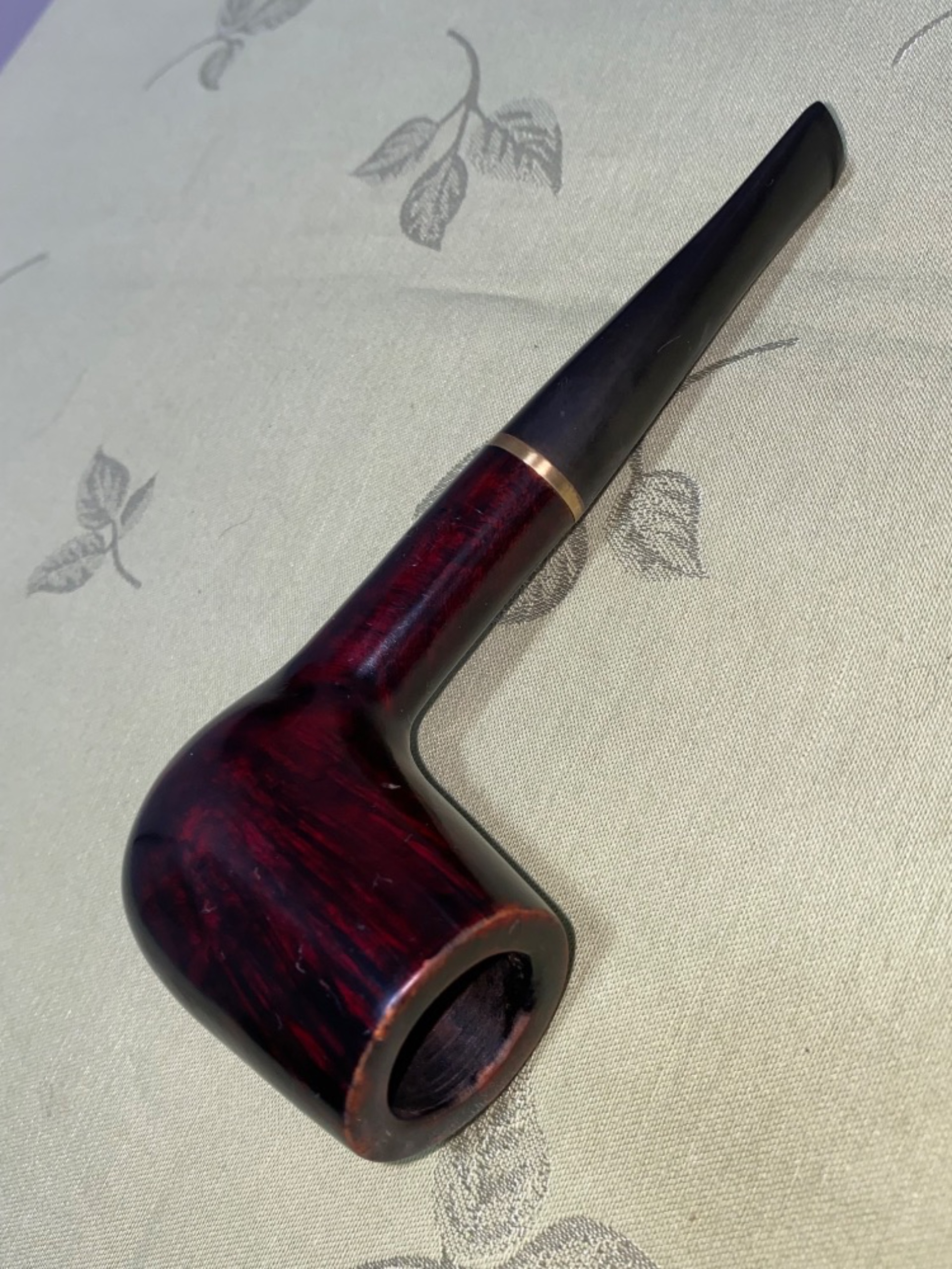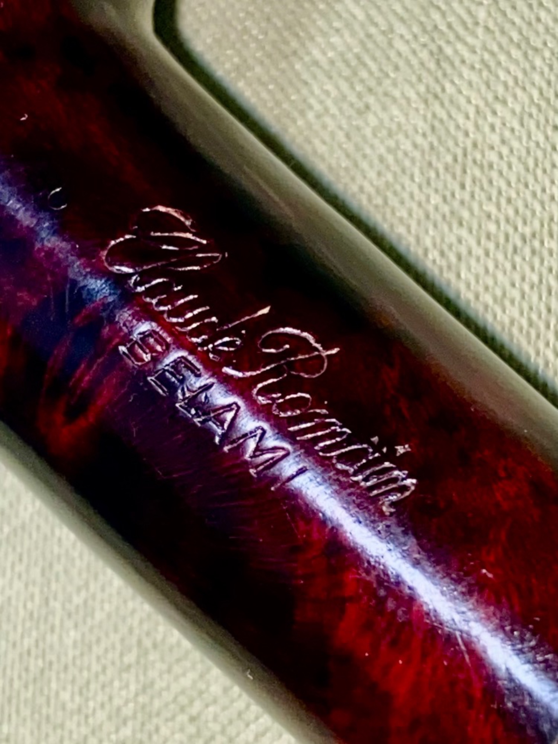 43. Alte gebrauchte Pfeife, gravierte Aufschrift CLAUDE ROMAIN SELAMI, auf der anderen Seite die Aufschrift "MADE IN FRANCE 9". Hergestellt aus Briar, ist sie ziemlich massiv und mit einem vergoldeten Metallring verziert. Die Pfeife ist in perfektem Zustand, wenig geraucht, die Kammer ist sauber und nicht durchgebrannt. In einer sehr schönen funkelnden roten Farbe. Länge 145 cm. Gewicht 45 g. Höhe des Kopfes 50 mm. Breite des Kopfes 35 cm.