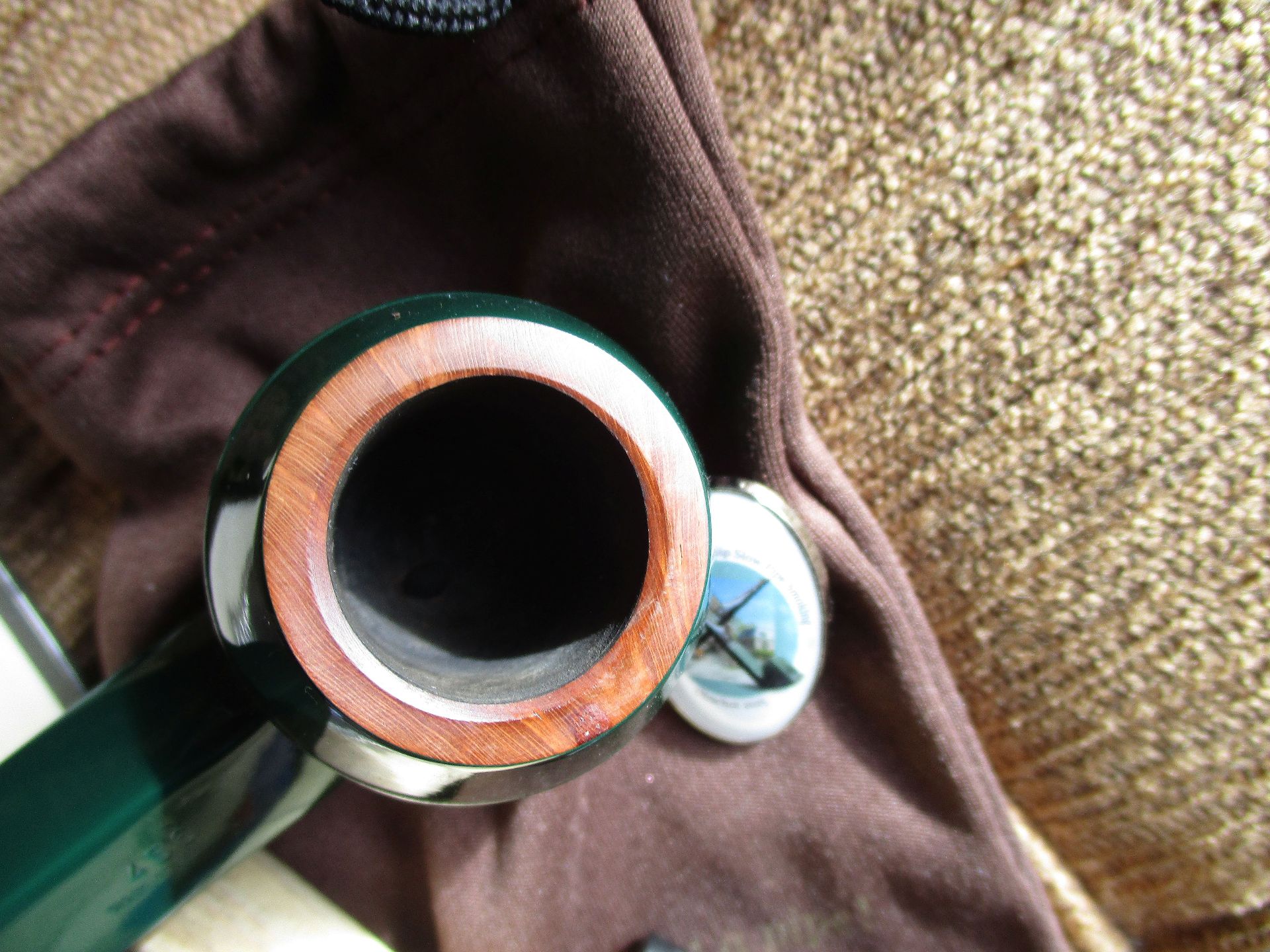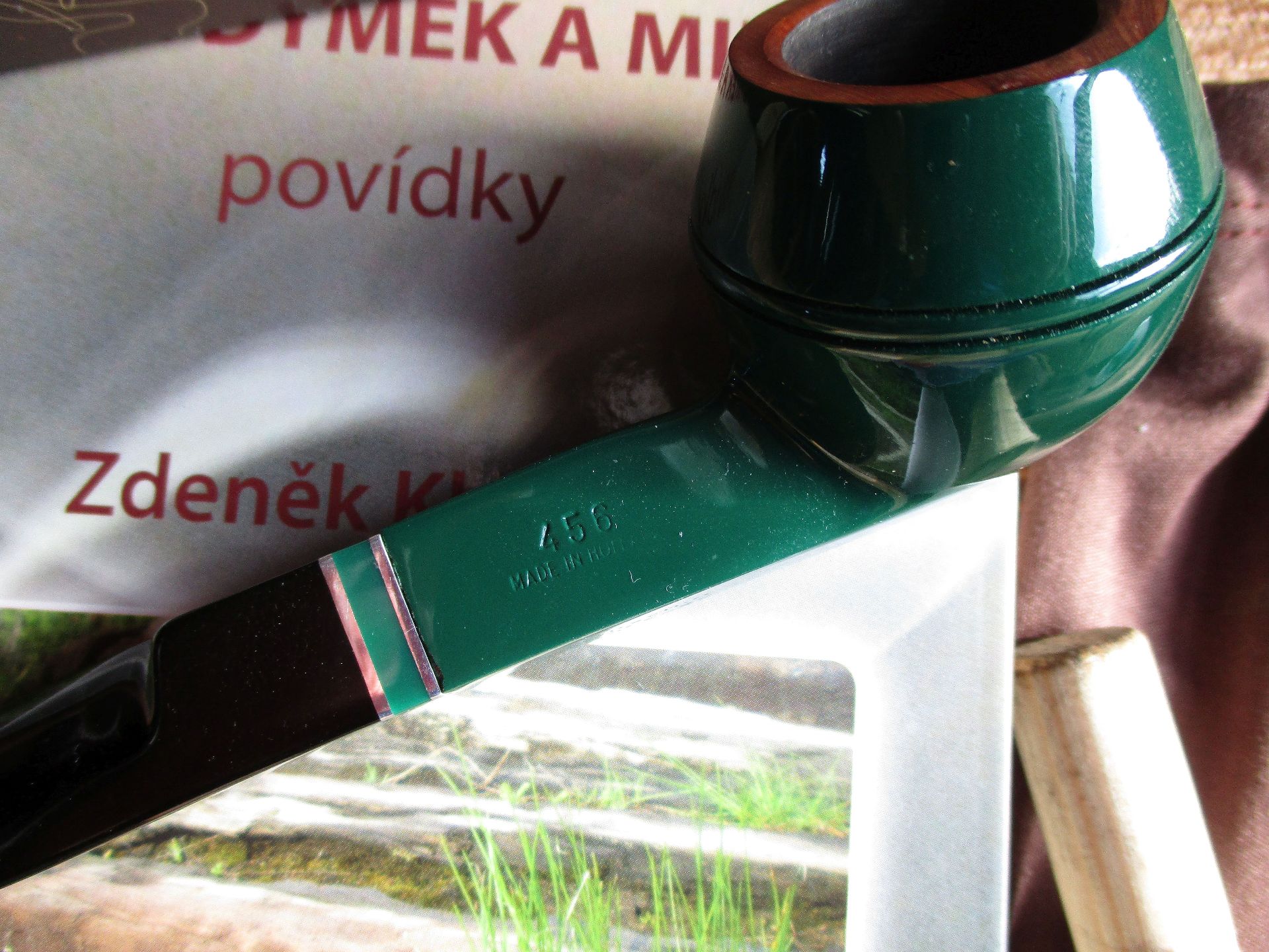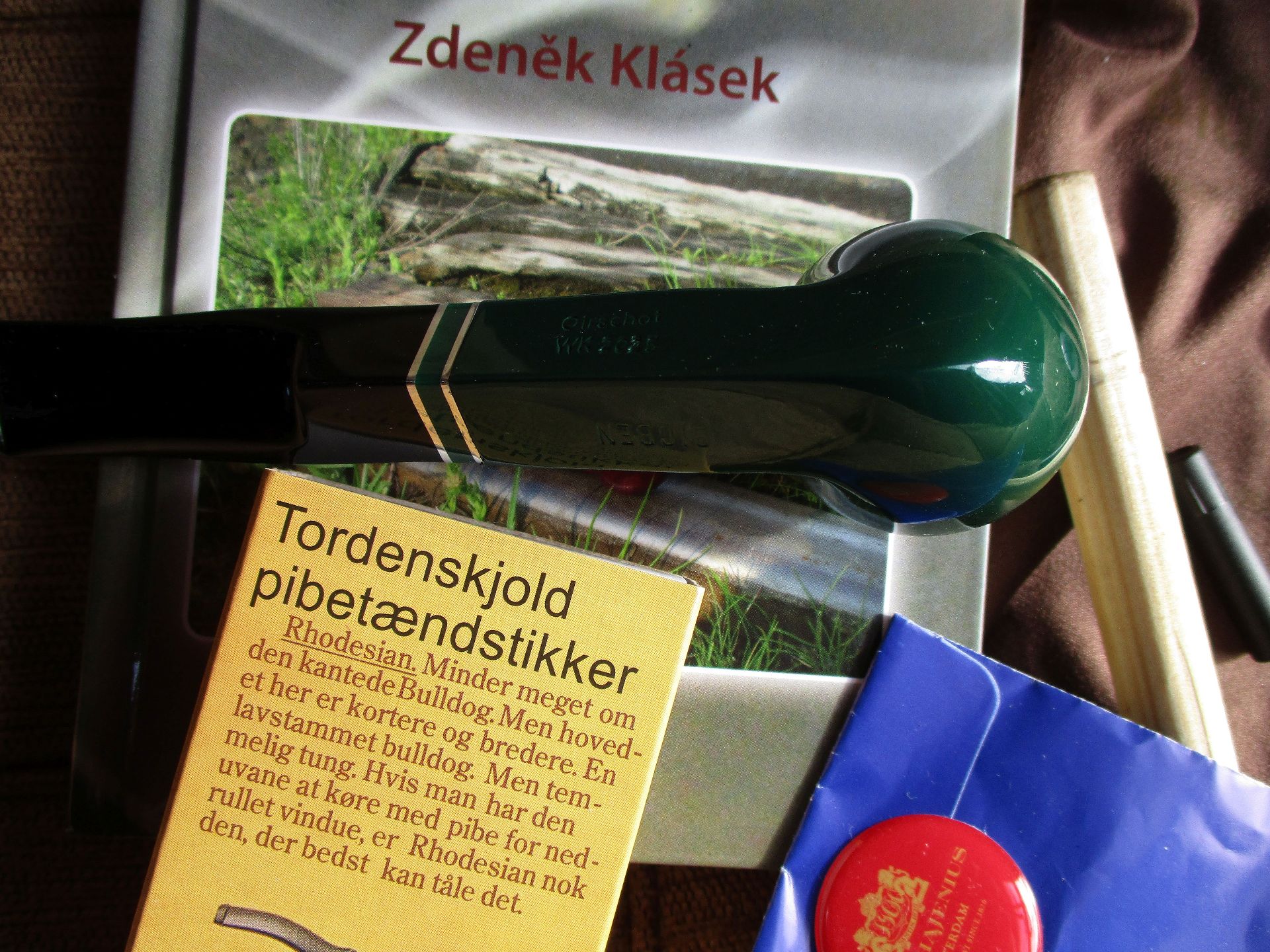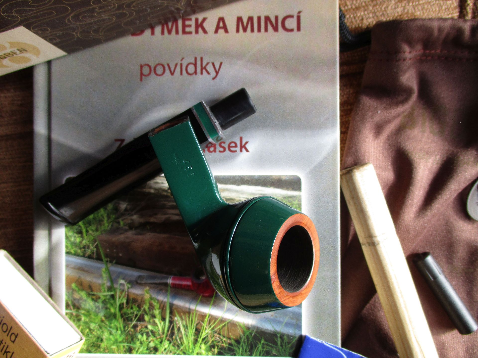 Tedy soutěžní dusátko, pytlík, krabička, krabička od zápalek, redukce na 6 mm filtr, odznak, sáček od soutěžního tabáku. Dýmka je dobře vrtaná, hladká, briár, akryl náustek, kovová aplikace. Celková délka 13,5 cm, průměr komory 20 mm, hloubka 32 mm, váha 30 g.