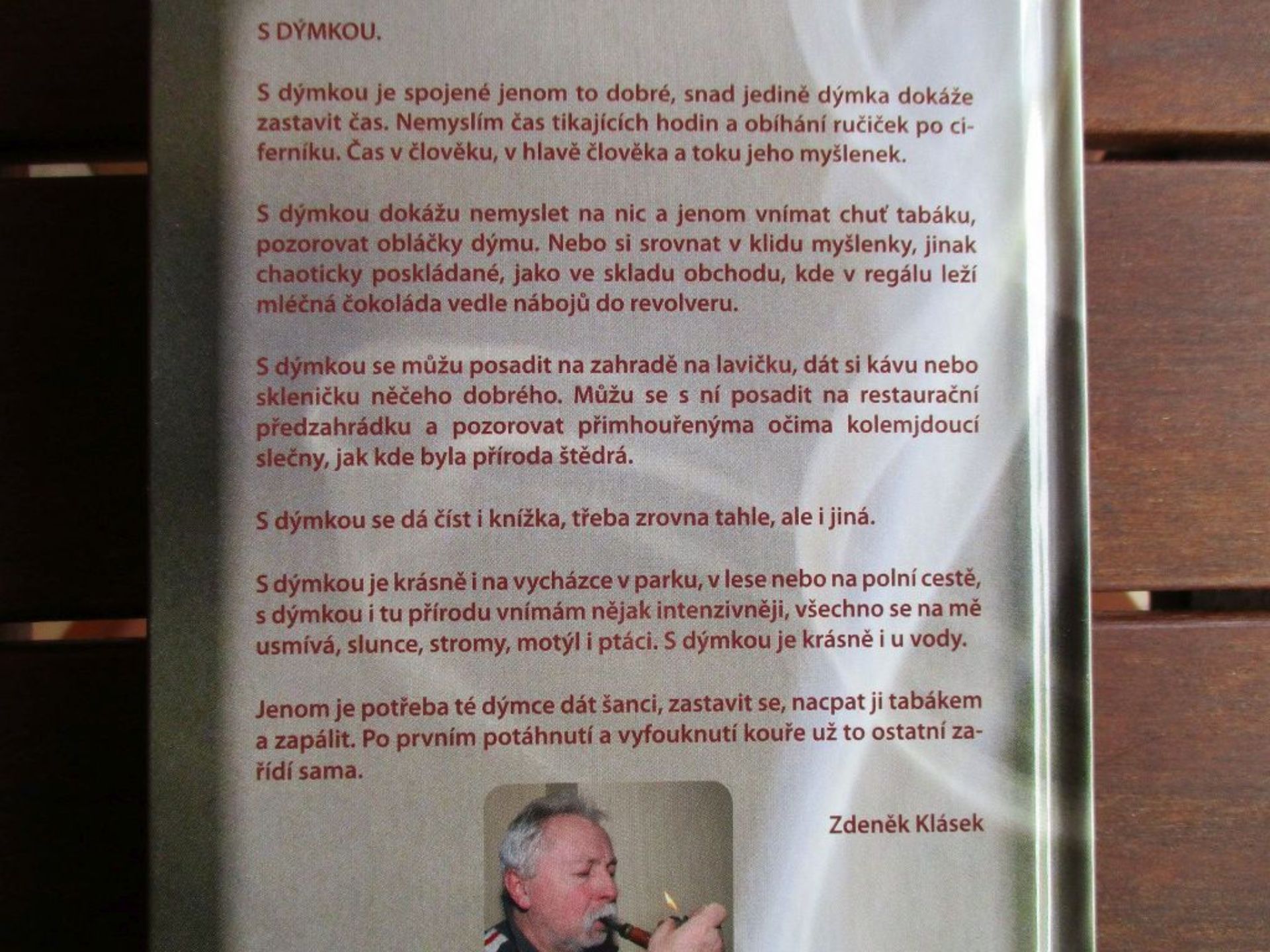 V knížce je 18 povídek a v každé je hlavní postava dýmkař. Čtení na pohodu s dějem zasazeným do reálných míst. Na zadní straně obalu je takové moje vyznání k dýmce. Napsal jí dýmkař, obal vytvořil dýmkař, ilustrace nakreslika dýmkařka, korektury dýmkařka a pro tisk připravil dýmkař. 😃