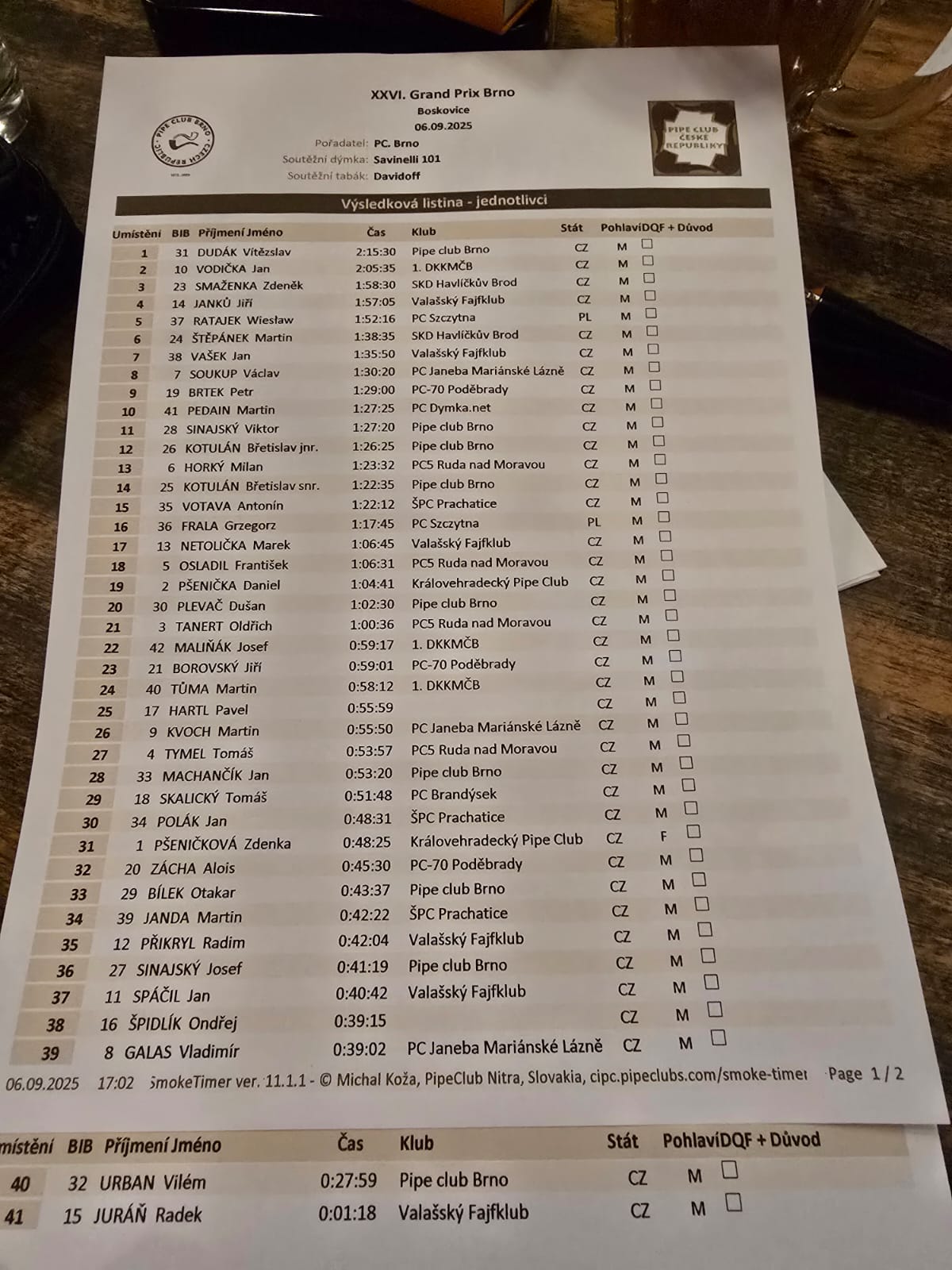 Jako jediná žena mezi soutěžícími Zdena Pšeničková dosáhla času 0:48:25 a zároveň se svým synem Danielem, který byl vůbec poprvé na soutěžním kouření (a obsadil skvělé devatenácté místo s časem 1:04:41), zvítězila v soutěži o nejlepší westernový kostým. Po předání cen a společné večeři následovalo posezení s doutníkem, takže saloon v závoji dýmu spíše připomínal pařezovou chaloupku, a pak už jenom tradá domů.