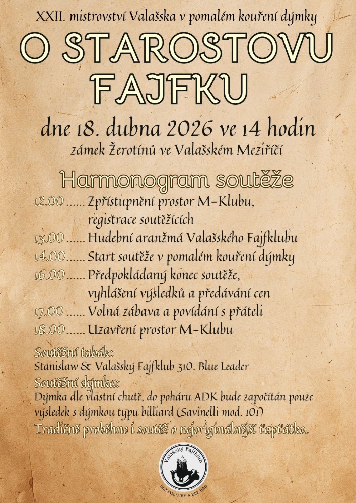 Valašský Fajfklub zve všechny kuřáky dýmek a fajfek na mistrovství Valašska v pomalém kouření dýmky - O starostovu fajfku, které se koná 18.4.2026 v zámku Žerotínů ve Valašském Meziříčí.