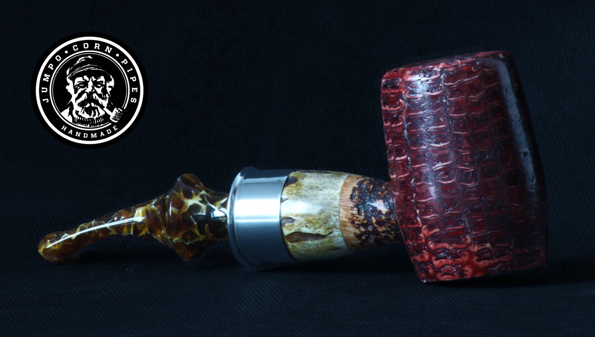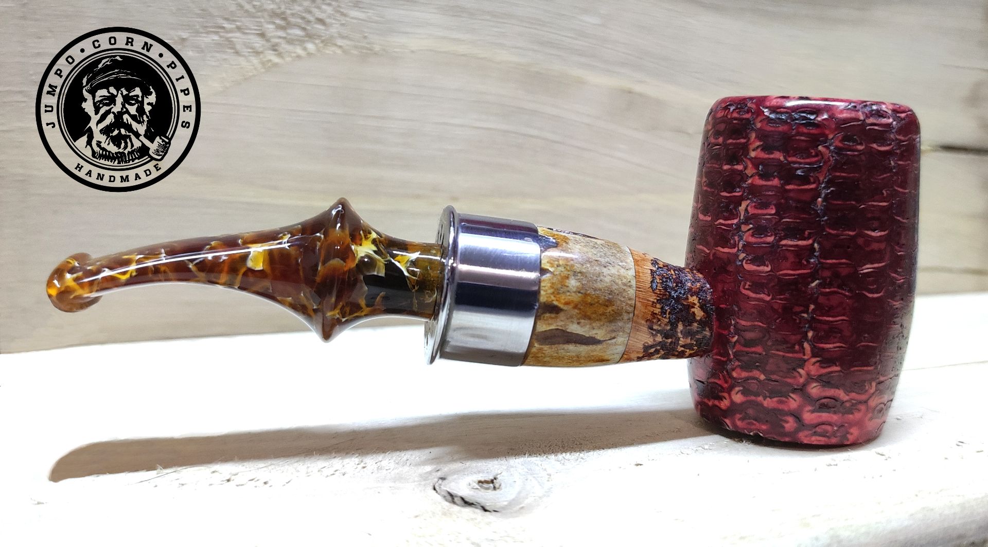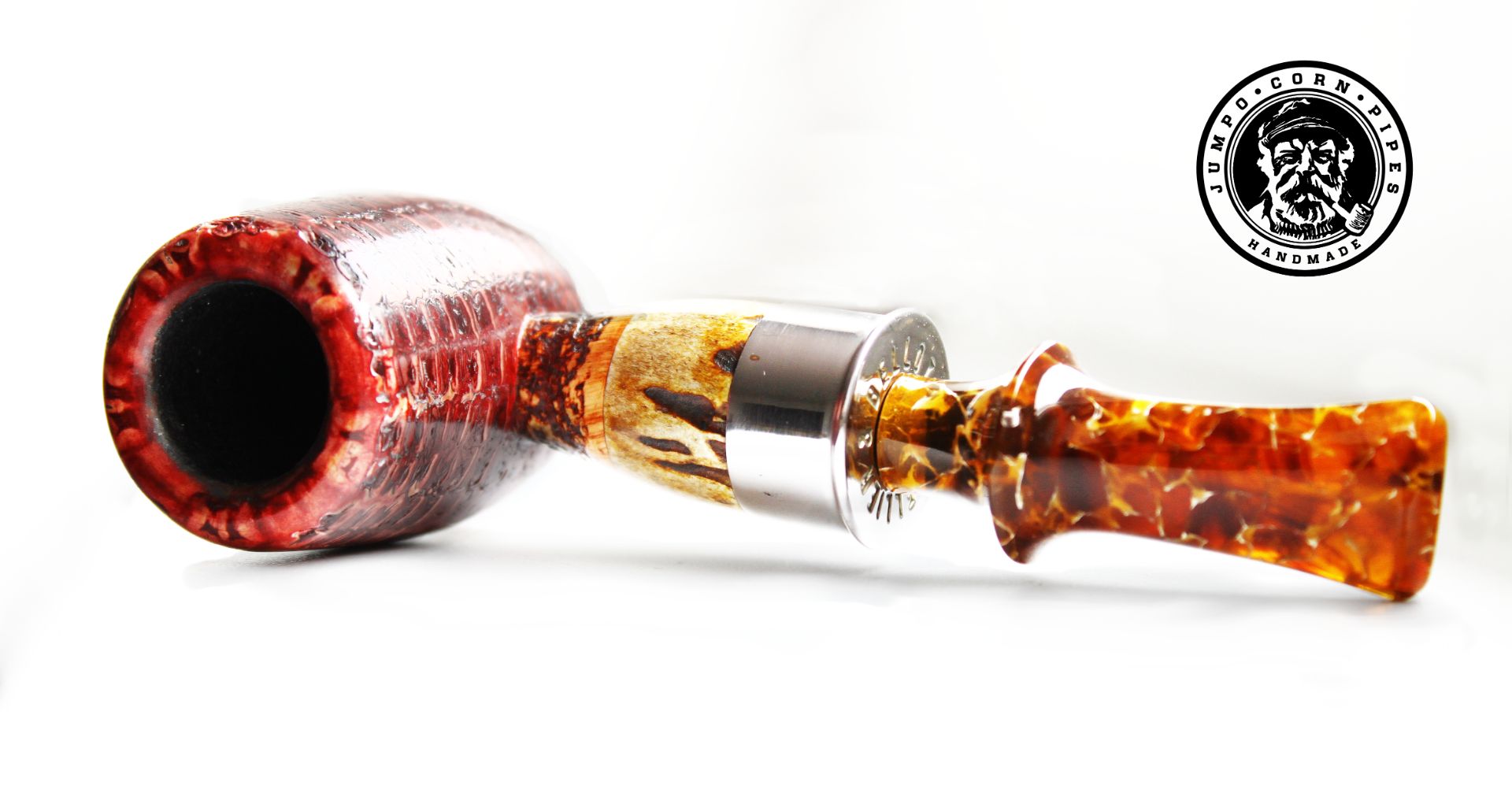 Kukuřičná dýmka osazená briarovým kolínkem v kombinaci se srnčím parohem a koncem z brokovnicové nábojnice.