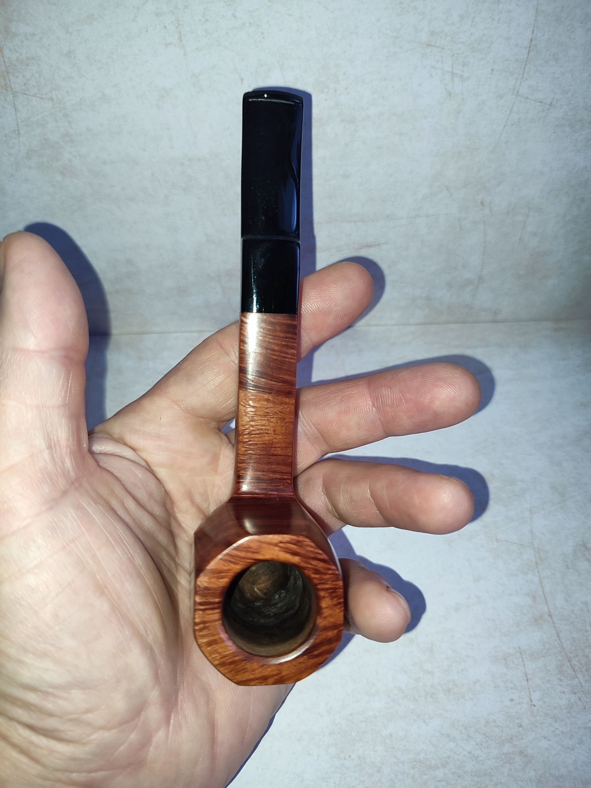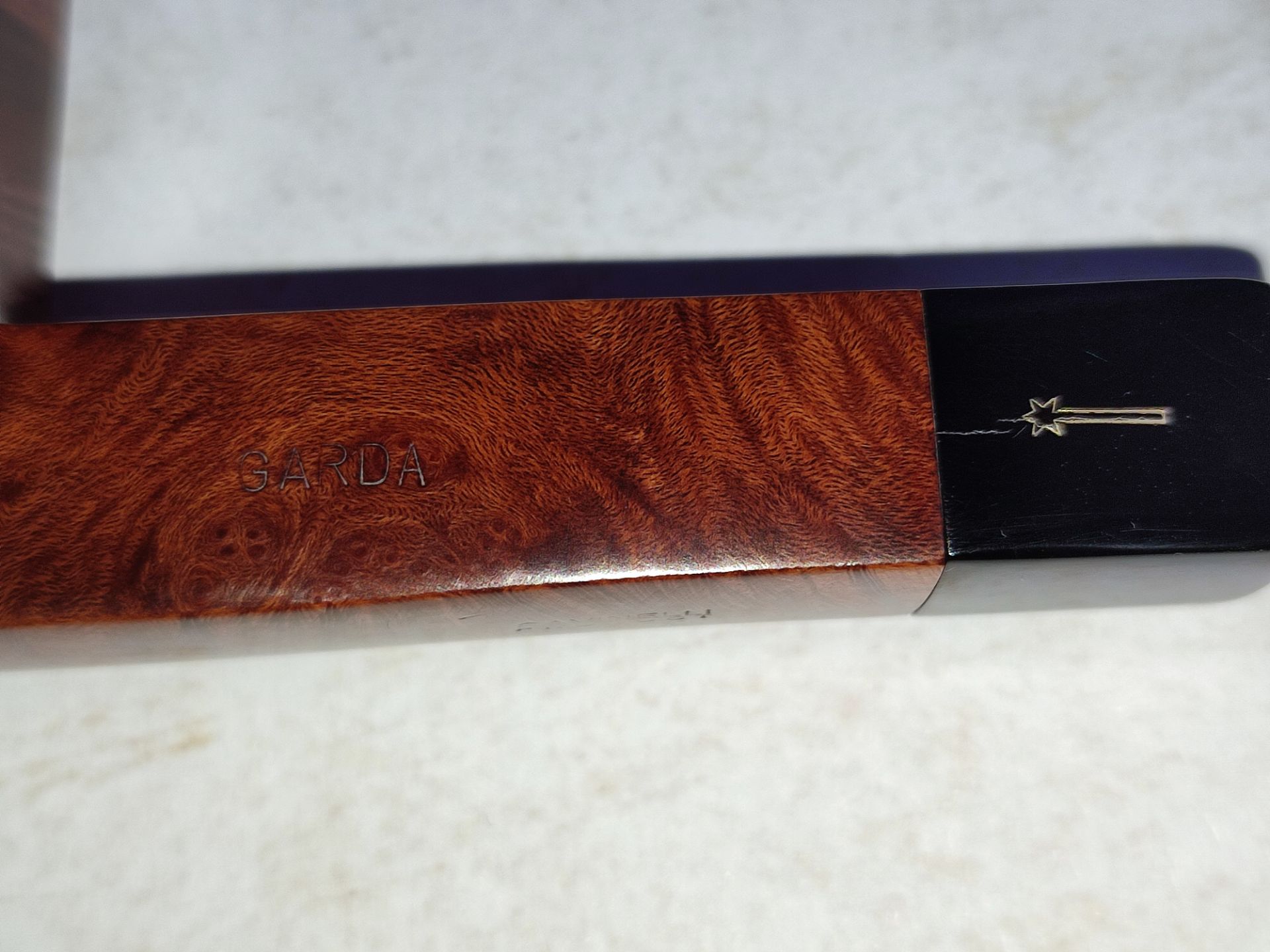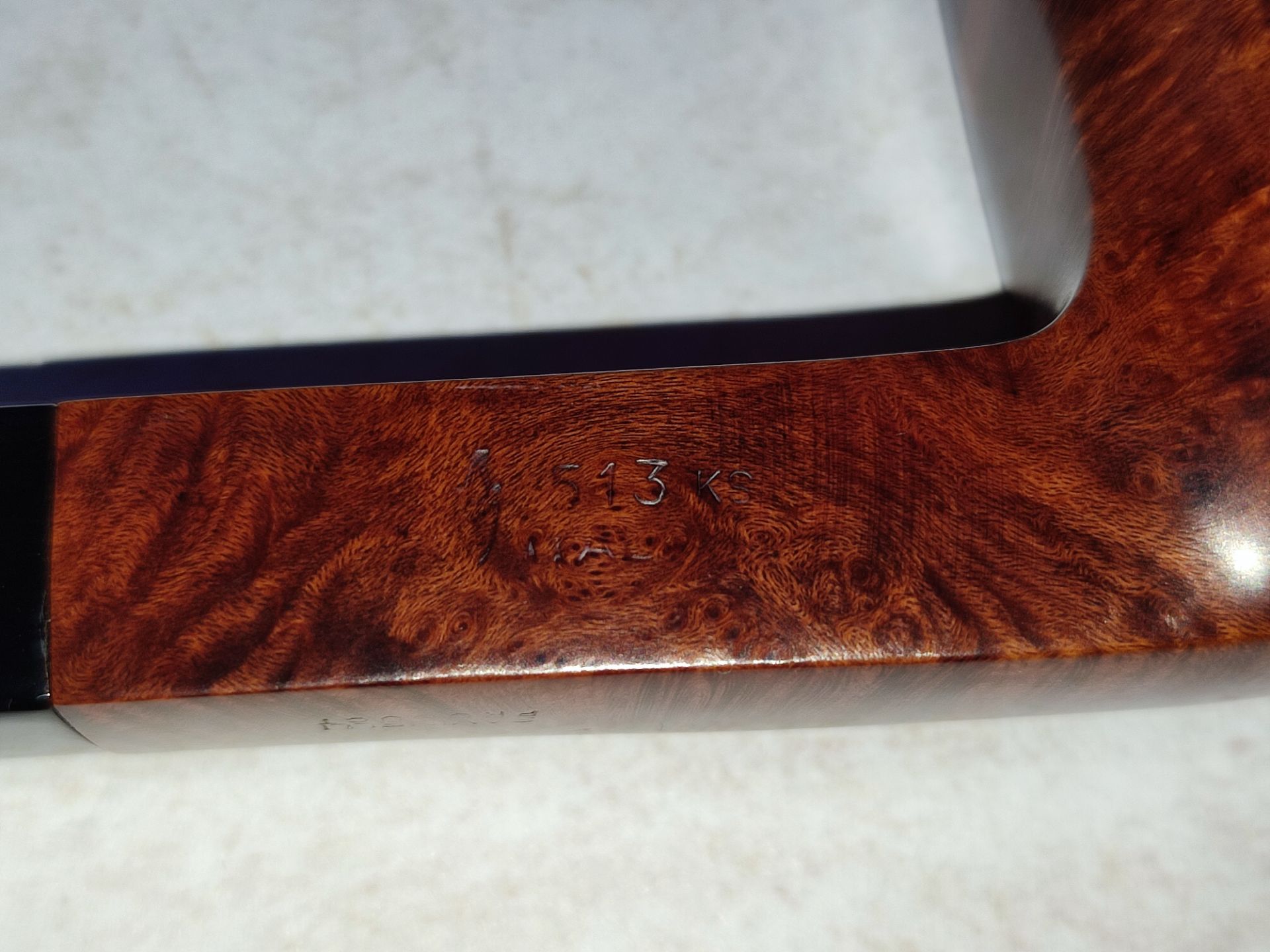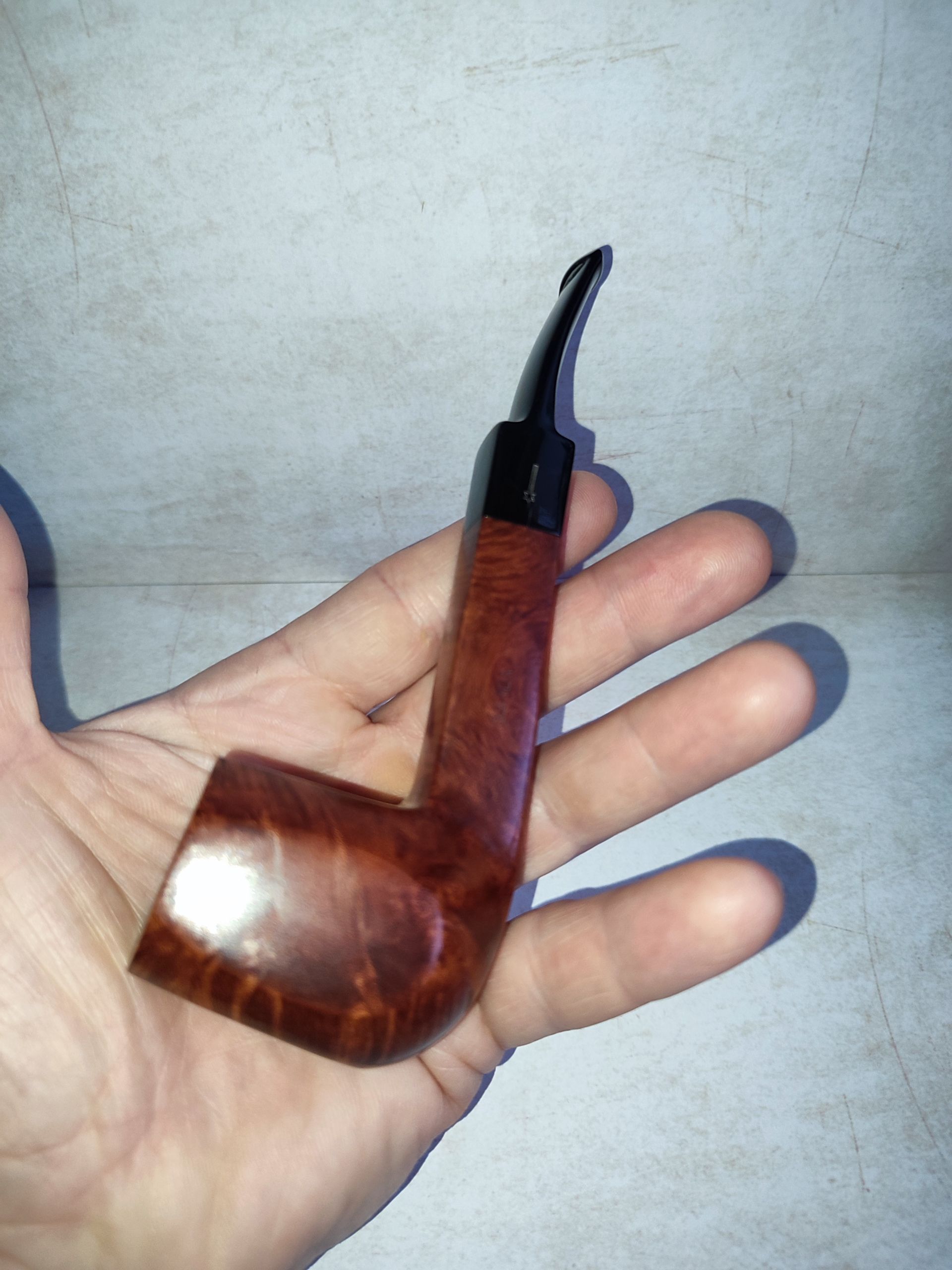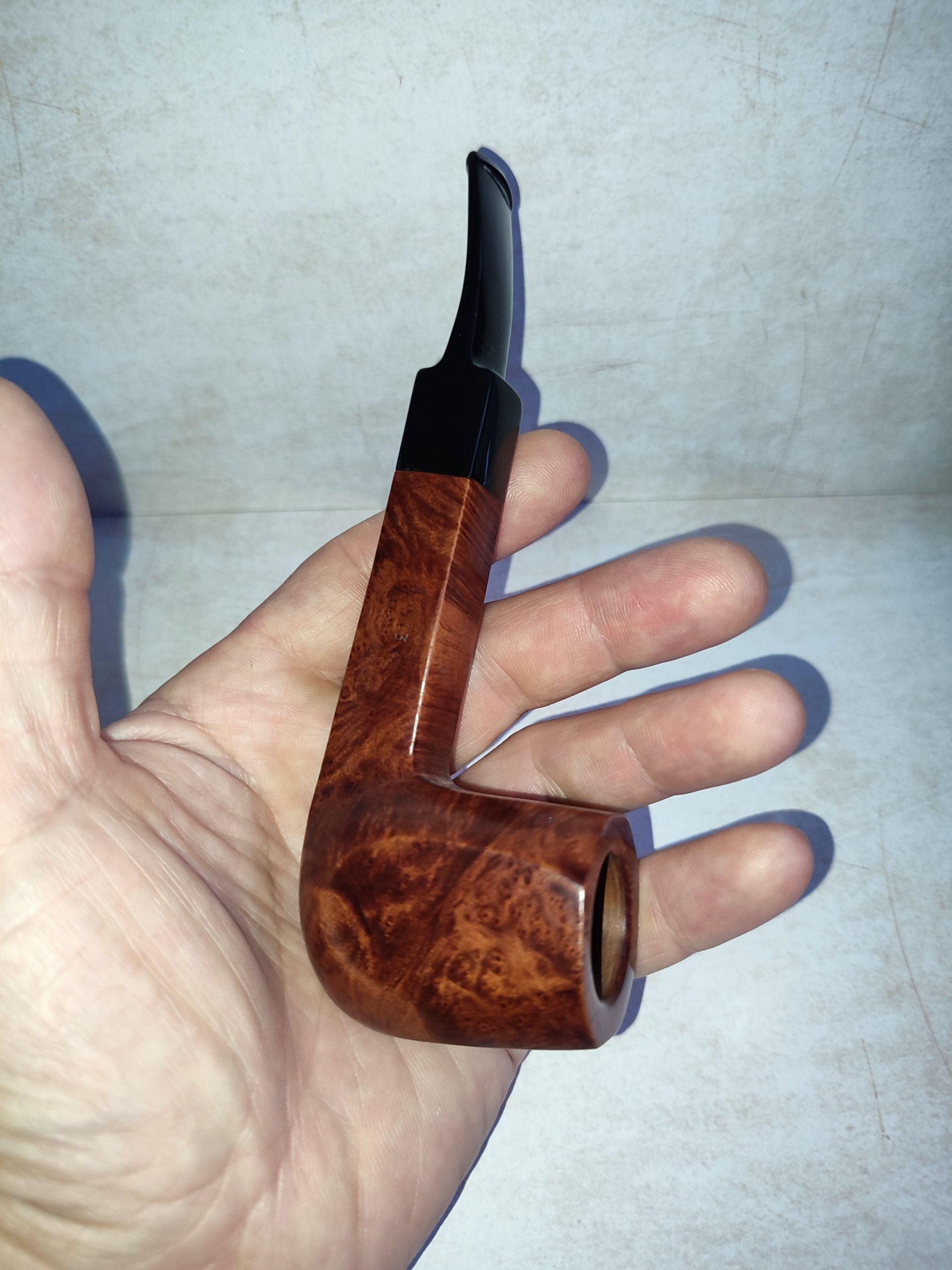 Predám taliansku briarovú dýmku od renomovaného výrobcu Savinelli. Ide o model zo série Garda s označením 513 KS (King Size). Tvar je klasický polozahnutý Billiard s hranatým dříkom, ktorý skvele padne do ruky. Dýmka je hladká, čo podčiarkuje nádhernú plamennú kresbu. Dýmka bola veľmi málo fajčená a starostlivo udržiavaná. Kotel je čistý, bez známok prepálenia, náustok (čierny akrylát) je bez poškodenia a ryh. 9mm filter.